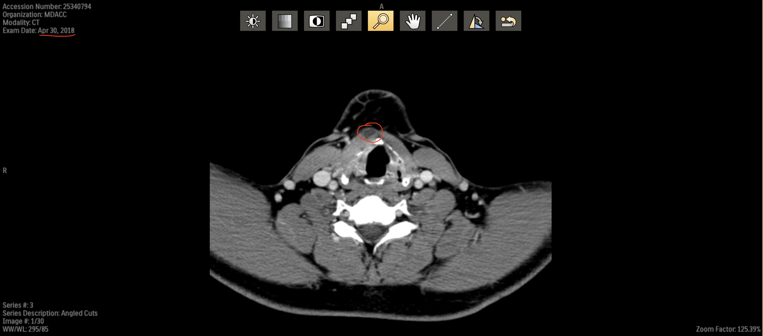 CT from 30 April 2018 (pre-treatment) shows the thyroglossal duct cyst (circled in red). Not infected at the time